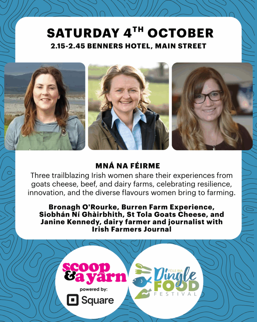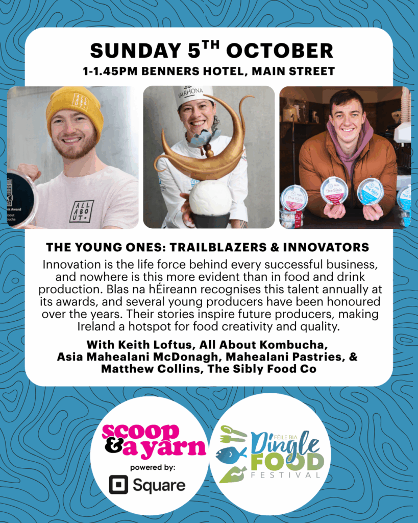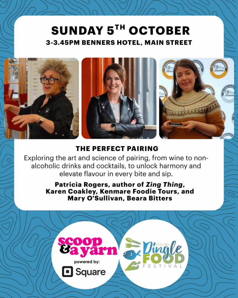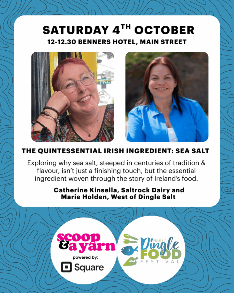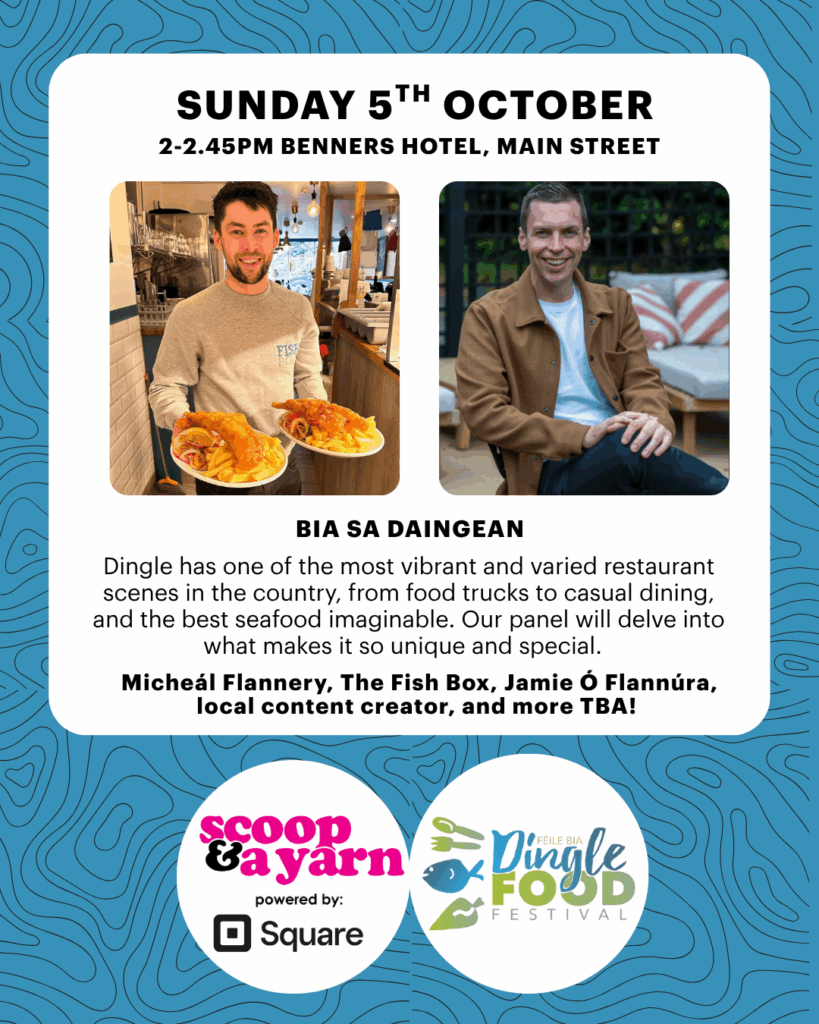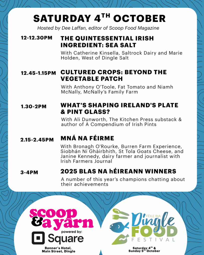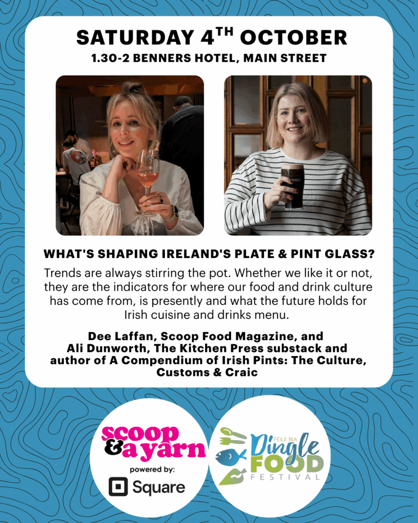 Scoop Food Magazine brings its food storytelling event ‘Scoop & a yarn’ to Dingle Food Festival this year in partnership with Ireland’s premier payment solution company, Square. Together they’ll be powering lots of chats with Irish food and drink producers, food writers, chefs, and local personalities to fuel two days of fun banter and craic. From food memories to kitchen tales, makers’ stories to local food history; conversations will abound. Hosted by Scoop’s editor Dee Laffan. The event is taking place in Benners Hotel on Saturday 4th October from 12-4pm and Sunday 5th from 1-4pm.
